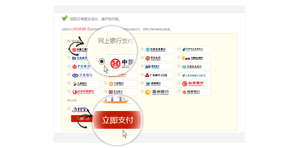 2、訂單提交成功,請選擇您將付款的銀行,點擊“立即支付”進行付款;